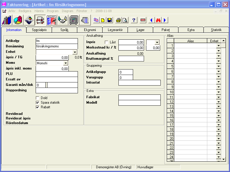 2. Starta FDT Service och lägg till artikeln i basregistret genom att ange artikelnr 'fm' i fältet Försäkr.moms.