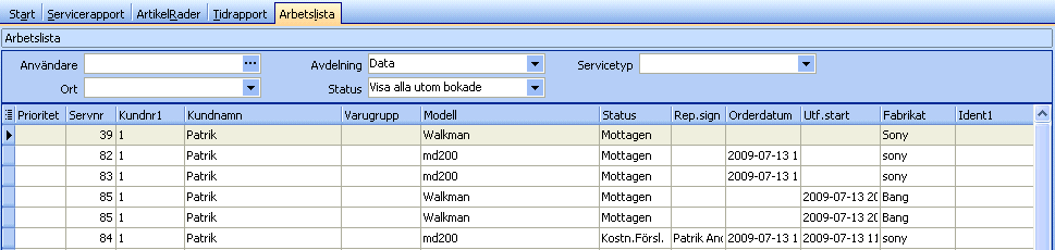 Arbetslistan sorteras som standard efter prioritet och därefter i vilken ordning servicerapporterna är mottagna. Arbetslistan visas som standard med inloggad avdelning som urval, samt status mindre än reparerad.