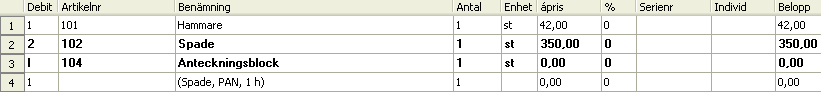 Lägg till de artiklar som fakturamottagare 2 ska betala i Artikelrader. I exemplet nedan kommer Fakturamottagare 2 att debiteras Artikelnr 102: