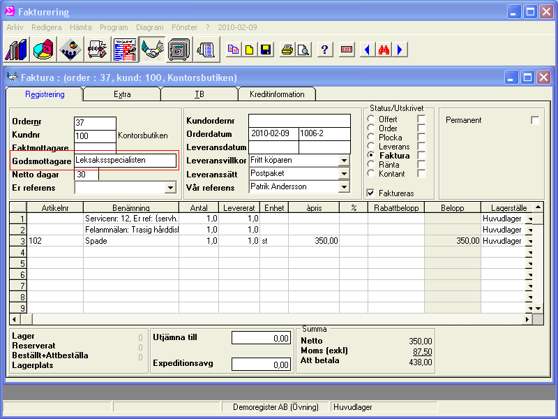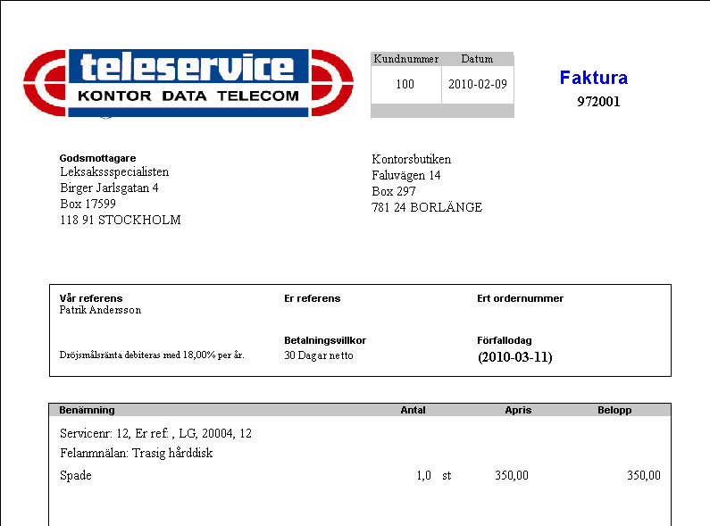 Faktura som genereras till Fakturamottagare 2 (Observera att Godsmottagare nu är angiven på fakturan):
