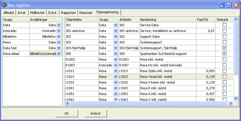 I vänster sida av fönstret görs inställningar för 'Grupp' och 'Avdelningar'. Här väljs exempelvis vilka avdelningar som ska ha tillgång till utvalda "tidgrupper" (grupper). Företag som endast har ett fåtal tidartiklar och inte är i behov av att begränsa och strukturera tidgrupperna kan lämna vänster sida av fönstret tomt. Samtliga artiklar kommer då att registreras som standardgrupp Tid.