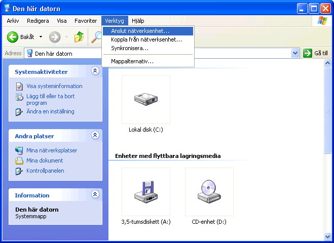 - 1. Gå till Den här datorn och klicka på Verktyg i menyn och sedan Anslut nätverksenhet..