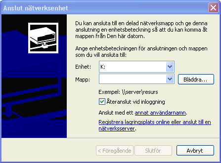 För att installationsprogramet ska kunna hitta programmappen krävs det att den läggs till som en nätverksenhet. Observera att programmappen måste vara utdelad på nätverket för att en nätverksenhet ska kunna läggas till.