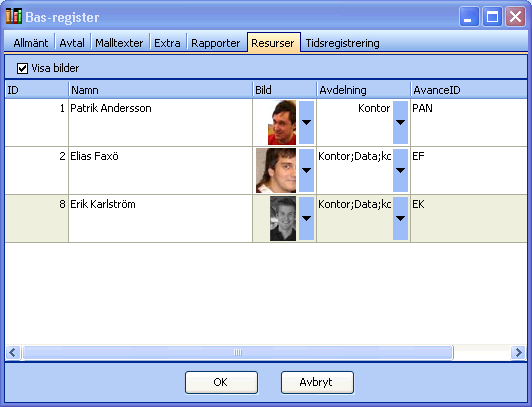 I resursregistret anges resurser med Namn, Bild, Avdelning och AvanceID . En resurs kan ingå i en eller flera avdelningar. Avance användarnamn kan anges i AvanceID om resursen är en användare.