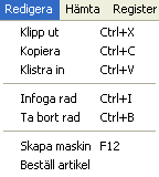 Beskrivning: Ovanstående kommando används för att ta bort en markerad artikelrad. Kommandot är endast tillgängligt under Artikelrader och i Avtalsregister under fliken Kundinfo.