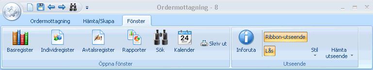 I fönster-menyn visas alla öppna fönster och här ges användaren möjlighet att anpassa utseendet på serviceprogrammet.