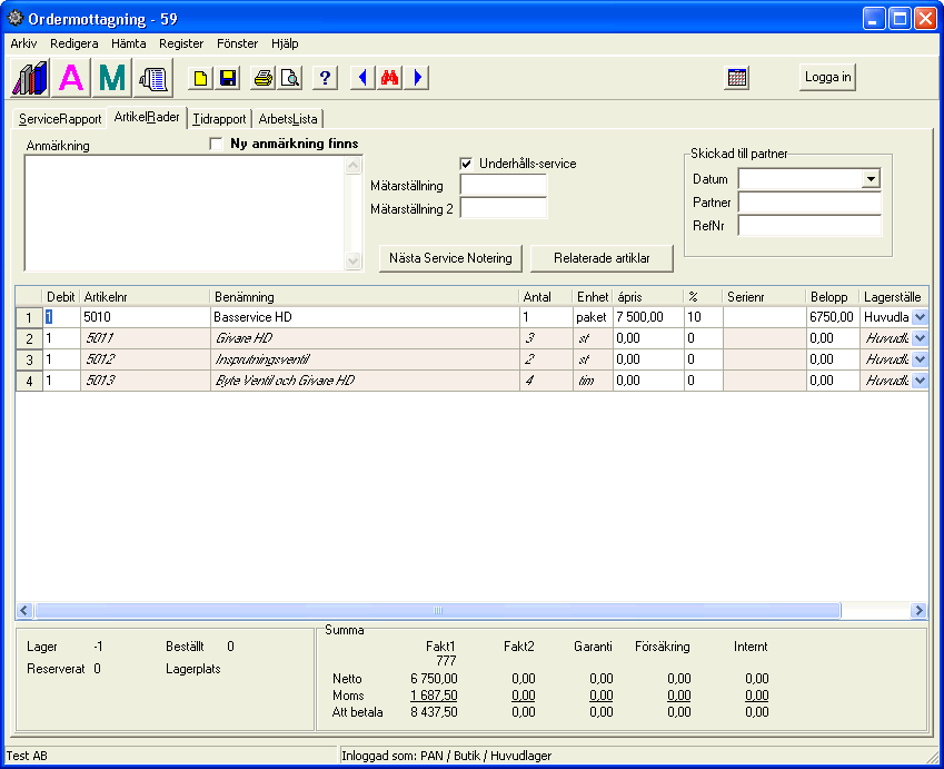 Under fliken 'Artikelrader' kommer boxen Underhållsservice att vara markerad. I Artikelraderna visas det ArtikelNr som valts i Individregistret under fliken Service. Observera att Underhållsservice kan markeras när som helst för att uppdatera när underhållsservice gjorts.