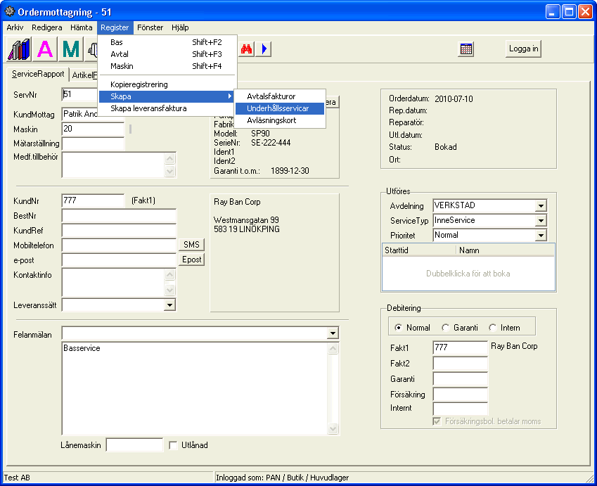 Klicka i översta menyn Register -> Skapa -> Underhållsservicear för att skapa en ny underhållsservice.