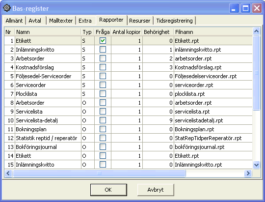 Under fliken Rapporter kan rapporter läggas till eller ändras. Här bestäms hur många kopior som ska skrivas ut och om programet ska fråga innan utskrift sker. Lägg till fler rapporter genom att markera det nedersta fältet och sedan trycka [Pil ner].