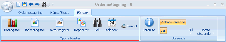 I fönstergruppen Öppna fönster visas alla öppna fönster. Här visas exempelvis Avtalsregister om avtalsregistret är öppet men minimerat.