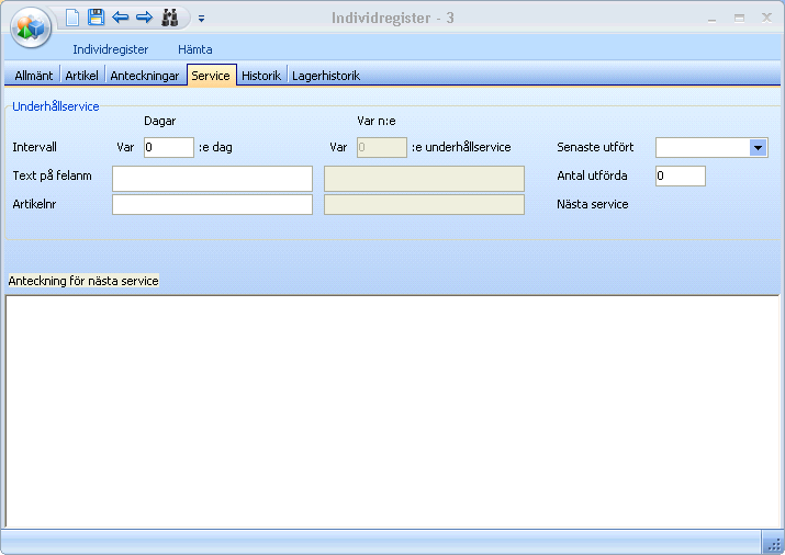 Klicka på Nästa service not för att göra en anteckning som ska visas vid nästa service av en individ. Genom att klicka på Nästa service not öppnas Individregistret med fliken 'Service' där anteckningar för nästa service kan göras.