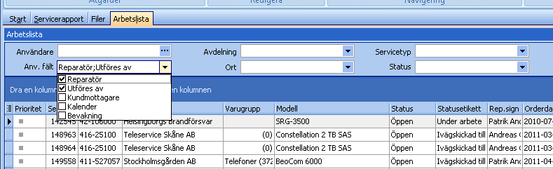 Man kan välja i arbetslistan från vilka fält arbetslistan ska baseras på. Valbara fält är Reparatör, Utföres av, Kundmottagare, Kalender och Bevakning.