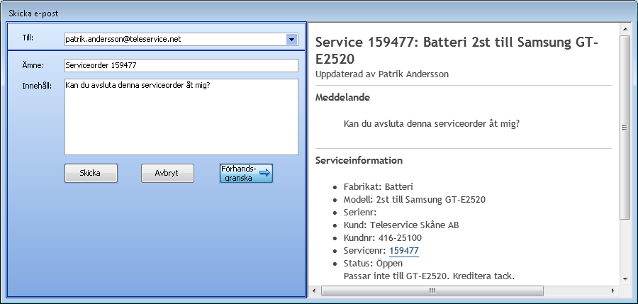 I de fält där det finns en meddelandesymbol kan man skicka epost till den mottagare som står i fältet. Det gäller både till kolleger och till kunder. Det är även möjligt att ange en egen epost-adress inne i dialogrutan. Man har möjlighet att skriva ett meddelande, som skickas tillsammans med information om serviceordern och de artikelrader som finns registrerade på den.