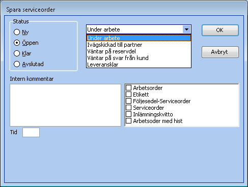 På varje status kan man sätta olika statusetiketter som beskriver närmare vilken status serviceordern har. Dessa statusetiketter kan man ställa in, lägga till, ta bort efter behov. Det är på statusetiketterna som man styr vilka utskrifter som ska ske. Som standard finns följande statusetiketter.